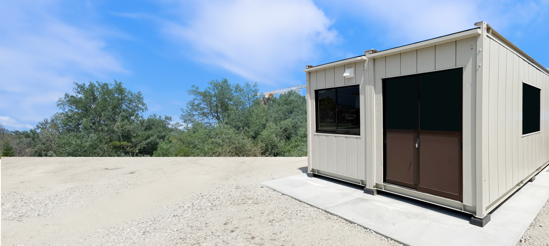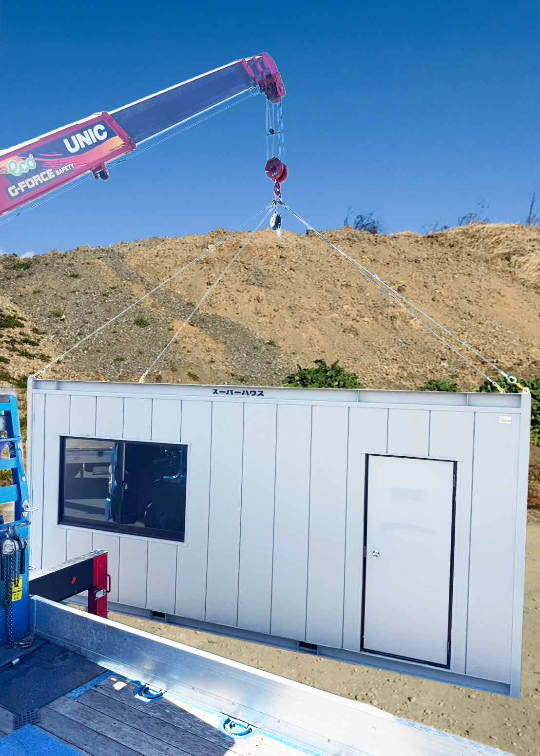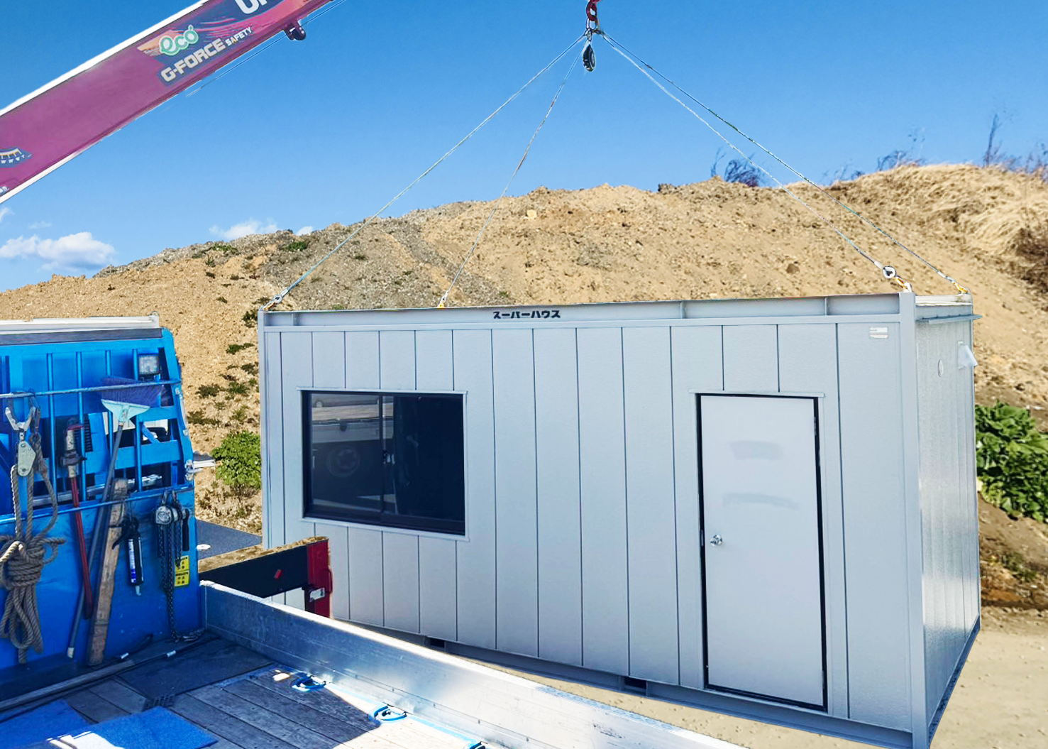 ユニットハウスとは、あらかじめ工場でつくられた箱型の建物を現地に運び、設置するだけで使える簡易建築物です。