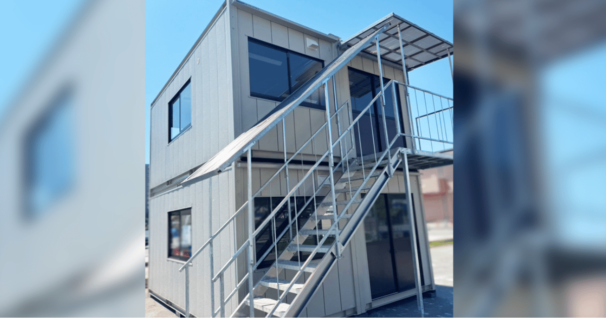 二階建てのユニットハウスは、上下にユニットを積み重ねる構造で設計されています。